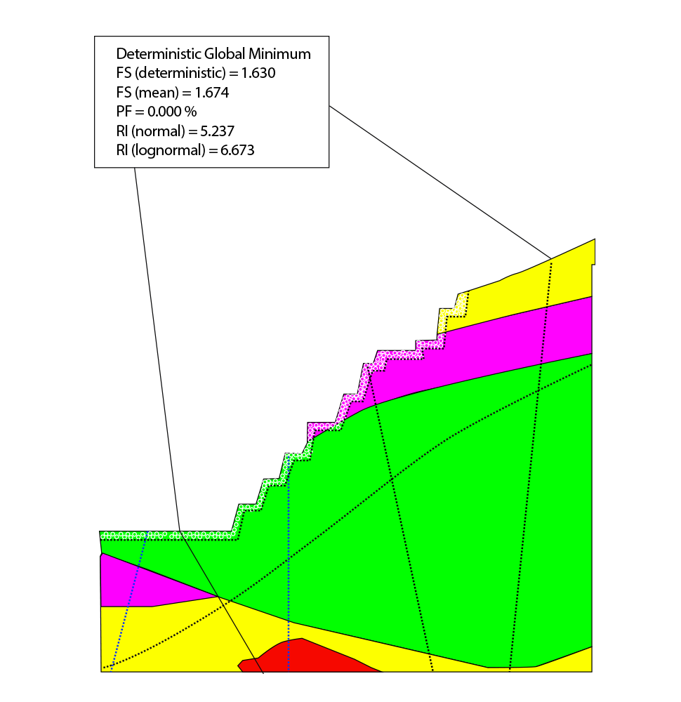 - Análisis determinísticos y probabilísticos de estabilidad de taludes en condiciones drenadas/ no drenadas y estáticas/dinámicas.
