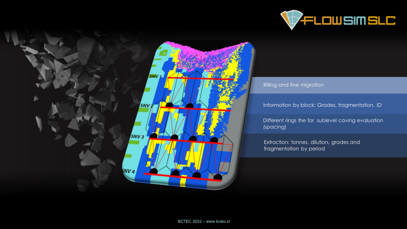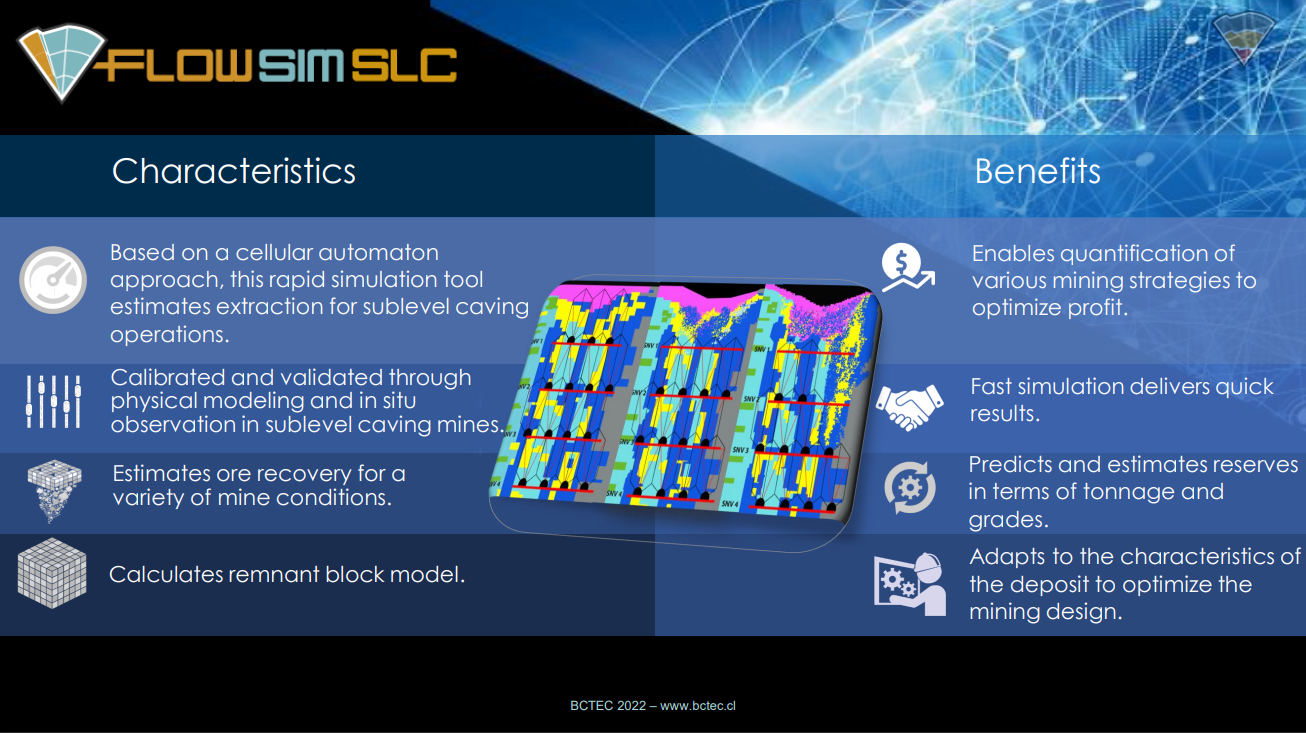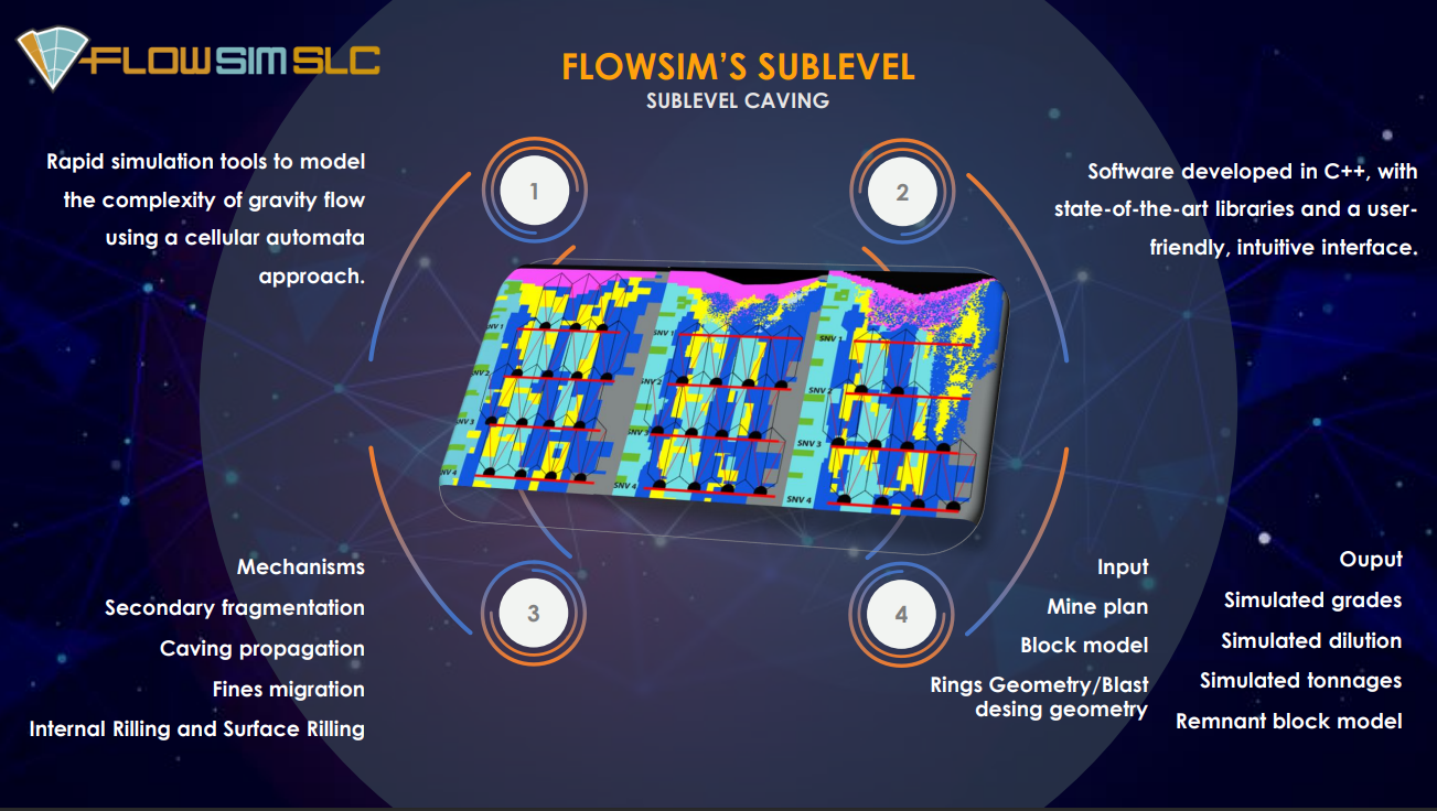 FlowSim SLC is a mine planning software that simulates gravity flow to efficiently estimate extractable reserves for Sublevel Caving (SLC) operations.