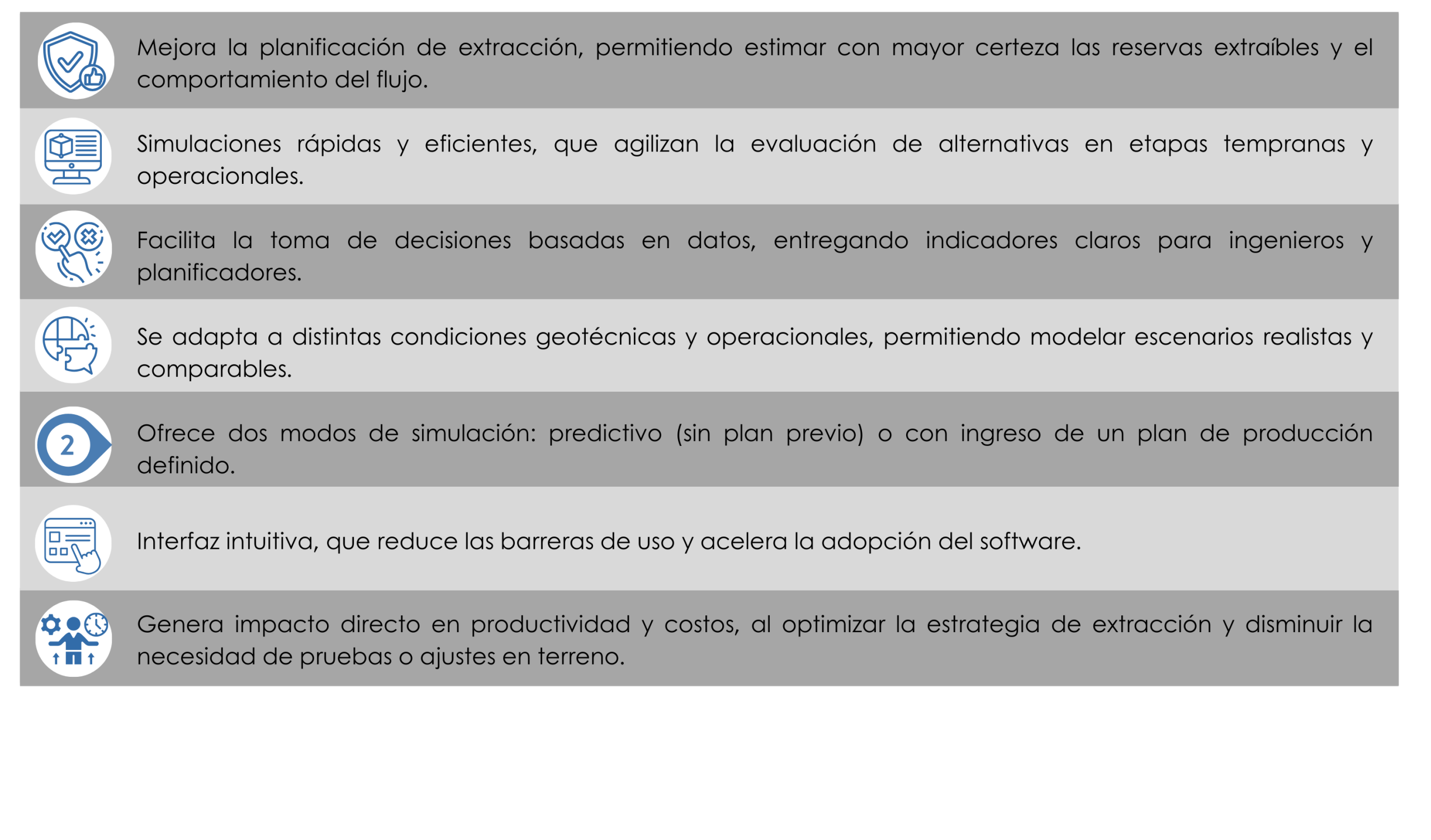 FlowSim SLC® es un software especializado en la simulación del flujo gravitacional aplicado a operaciones de Sublevel Caving (SLC). El modelo permite representar el comportamiento del mineral bajo distintas configuraciones de diseño, incorporando las principales restricciones técnico–económicas del proyecto y las condiciones geotécnicas propias del método.