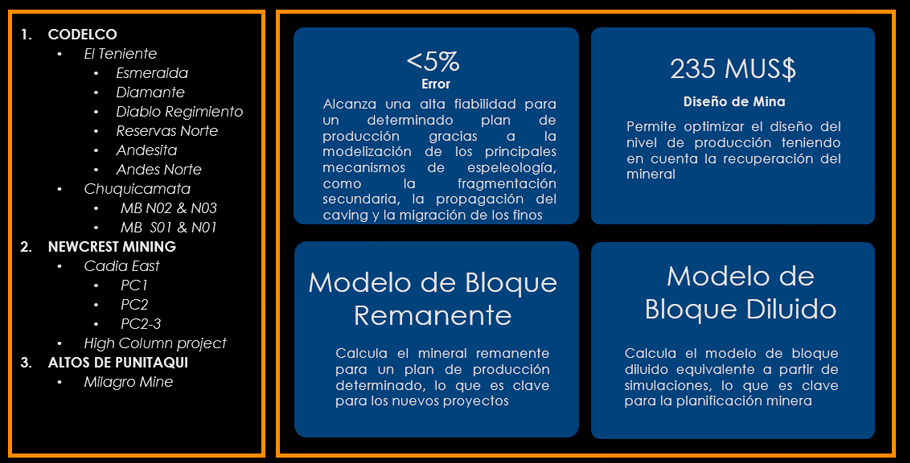 El software ha sido ampliamente calibrado y validado mediante experimentos y con operaciones de caving, lo que garantiza una alta confiabilidad.
