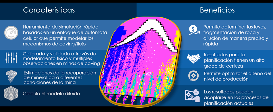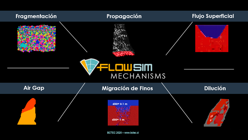 FlowSim tiene la capacidad de similar explícitamente los principales mecanismos del flujo gravitacional en minería de caving: propagación del caving, mezcla, migración de finos y fragmentación secundaria.