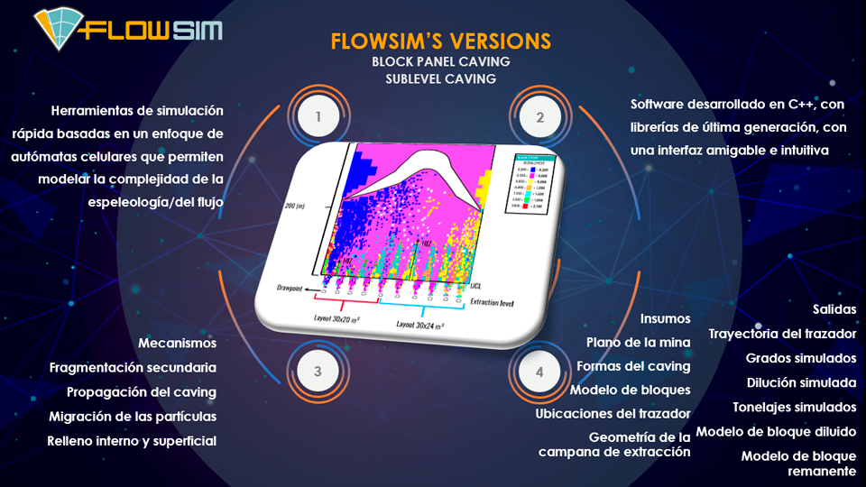 FlowSim es una herramienta que permite caracterizar el flujo gravitacional, en términos de tonelaje, ley y fragmentación, con resultados fiables, adaptándose a la realidad de los diferentes yacimientos, lo que permite evaluar diseños y planes mineros para así optimizar la extracción de mineral en minas de Block/Panel y Sub Level Caving.